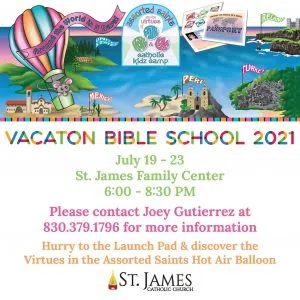 Gutierrez says while most Vacation Bible Schools are during the day, others are held in the evening. He says this year’s VBS at St. James will be held from July 19-23 from 6 to 8:30 p.m. He says this particular year, they will be focusing on the Assorted Saints and the Virtues of Hope, Faith and Love.