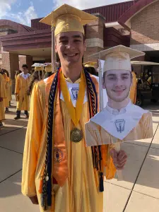 The Seguin Daily News on Thursday caught up with Sam who found carrying around a customized photo of his twin brother on a stick. Now although Will has already made it back in town for tonight’s ceremony, he wasn’t available for the group’s senior photo.