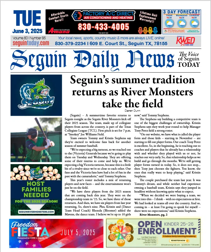 SDN: June 3, 2025 Seguin, TX, USA / Seguin Today Darren Dunn Jun 3, 2025 | 5:01 AM Here’s today’s Seguin Daily News. Click here to read this edition.