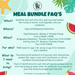 District officials say schools such as McQueeney and Vogel Elementary also participate in the program by providing Non-congregate Grab & Go Meal Bundles. They say these have especially been important for those families who can’t find their way to these meals on a daily basis. The meal bundles provide food to families one week at a time. The children are asked to be in the vehicle during pickup.